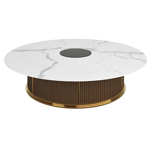 陶瓷岩板,意思是“燒(shāo)結(jié)的石頭" , 是由天然(rán)原料經(jīng)過特殊工藝,借助萬噸以上壓機壓製(超過15000噸),結合先進的生產技術,經過1200℃以上高(gāo)溫燒製而成,能夠經得起切割、鑽孔、打磨等加工過程的超大規格新型瓷質材料。餐桌麵(miàn)或者是轉盤麵采(cǎi)用岩板設計,具有輕、耐(nài)磨、無滲透等優點。