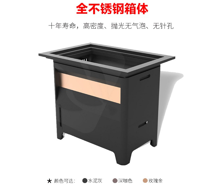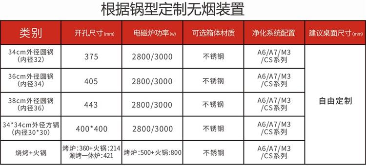 可定(dìng)製範圍:智能化觸屏板、配套火鍋電磁爐、油煙淨化裝置、抽(chōu)風組件、全(quán)不(bú)鏽鋼箱體、USB充電插座、配(pèi)套鍋型和鍋圈、火鍋台麵、框架、無線充電等等。