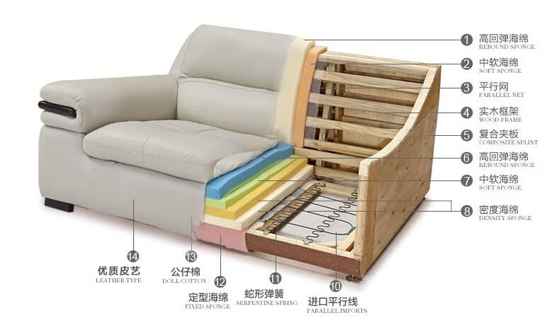 沙(shā)發(fā)木結(jié)構的(de)牢固程度(dù):沙發分內木(mù)架和外木架,木結構的牢固(gù)程度決定沙發的使用壽命,木材的質量有優劣等級。有些家具用邊角餘料甚至樹皮料填充沙發靠背(bèi)或扶手側麵,分量不輕,但使用久一(yī)點就會斷裂。價格低(dī)一點的一般用雜(zá)木,中等的有用鬆木,內骨架用東北落葉鬆,要(yào)比一般的鬆木硬,不易變形,咬釘牢固。外木架則以美國黃楊木(mù)為主,不變形、不開(kāi)裂、紋理清晰。骨架的輔助結構還有單麵板、中纖板、膠合板等,不僅材質差別很大(dà),板材的原料也影響沙發的牢固,板材的優劣等級也同樣(yàng)影響沙發牢固