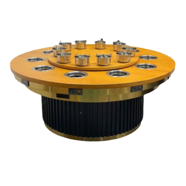 海(hǎi)德利火鍋家具為(wéi)您提(tí)供10人位一人一(yī)位無煙淨化小火鍋桌圖片展示價格說明定做(zuò)服務。10人位一(yī)人一鍋無煙淨(jìng)化小火鍋桌是(shì)一款為多人(rén)聚餐設計的創(chuàng)新餐桌,直徑2米,適合10人同時使用。每個座位都配有獨立(lì)的小火鍋,並內置(zhì)無煙淨化功能,有效消除油煙和異味,保(bǎo)持用餐環境(jìng)的清新,無需(xū)安裝排煙管道,使用方(fāng)便。 這款火鍋桌(zhuō)采用白蠟木材質,桌麵展現出自然的(de)木紋(wén)和(hé)溫潤的色調,既美觀又(yòu)實用。桌麵具備耐高溫、耐磨、耐刮等特點,經久耐用。每個座位配備了電磁爐或電陶爐,食客可以根據個人喜(xǐ)好(hǎo)調節火(huǒ)力,提供(gòng)個性化的用餐體驗。 無煙淨化小火鍋桌不僅(jǐn)適合家庭聚會,還非常適合餐廳、酒店等(děng)商業場所,既(jì)提升了(le)用餐體驗,又具備便利性和環保性。