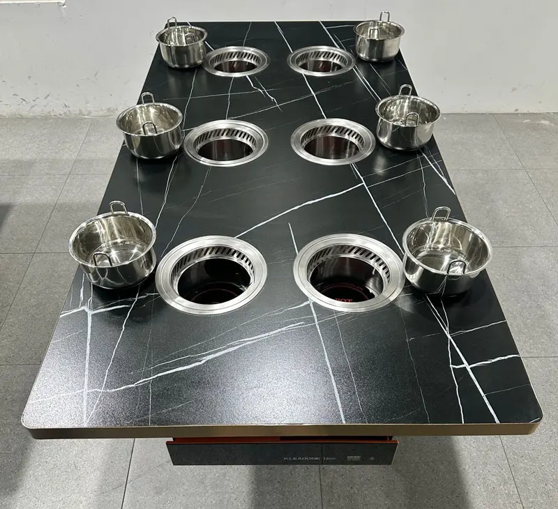 本(běn)款火鍋桌專為高端自助(zhù)餐廳打造,采用“一人一鍋”獨立就餐設計,內嵌六個獨立電磁爐位,搭配高效(xiào)無煙淨化係統,有(yǒu)效控製油煙(yān)擴散,提升用餐(cān)體驗與環境品(pǐn)質。整體外觀現代簡約,黑色大理石紋(wén)理台麵搭配金色邊框,兼具功能性與視覺美感。