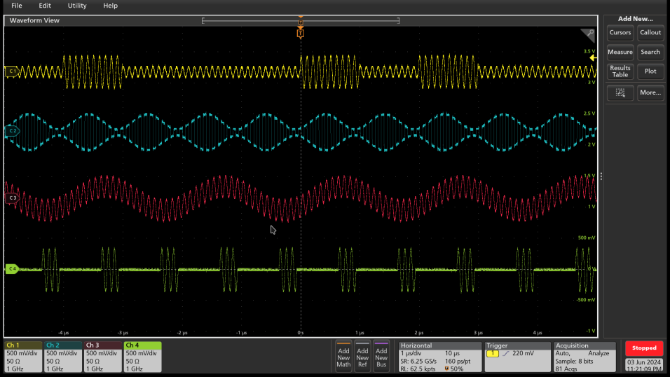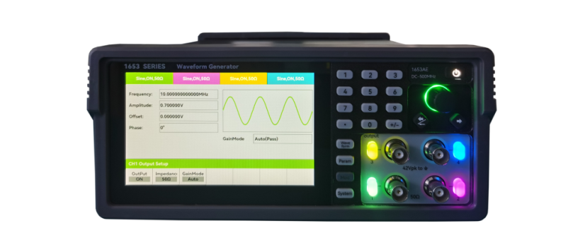 1653係列函數(shù)任(rèn)意波形發生器包(bāo)含120MHz、250MHz、350MHz、500MHz和1GHz 5種帶寬機型,滿足客戶(hù)不同輸出信號頻(pín)率的信號發生需求。500MHz帶寬及以下型號支持2或4個輸出通道,通道之間(jiān)可耦合輸出(chū),如CH2=CH1、CH2=~CH1,CH2=CH1+CH2等,通道CH1、CH2及CH3、CH4可作為差分信號輸出。