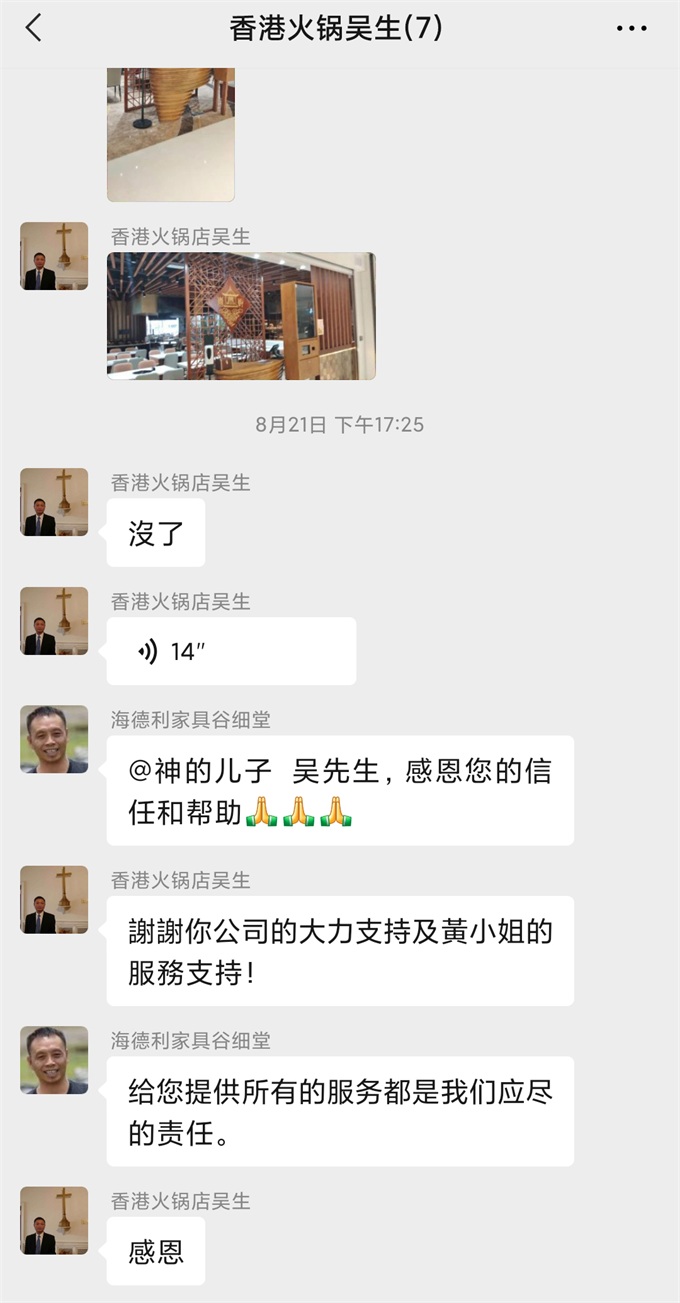 在和喜(xǐ)亭軒火鍋項目負責吳先生合(hé)作的(de)過程,公司和吳先生(shēng)都會站在對方的立場上做事情,雙方都很配合。這個訂單生產的很順(shùn)利。我們(men)的產品到達(dá)客戶餐廳後得到客戶的認可。在和(hé)吳先生的溝(gōu)通中得知他是香(xiāng)港裝修從業員工會副秘書長,會幫助我們宣傳產品。