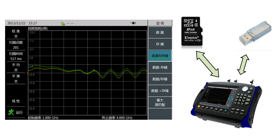 對測量跡線或狀態進行存儲,存儲介(jiè)質可選擇儀(yí)器內部FLASH存儲器、SD卡、USB設備。