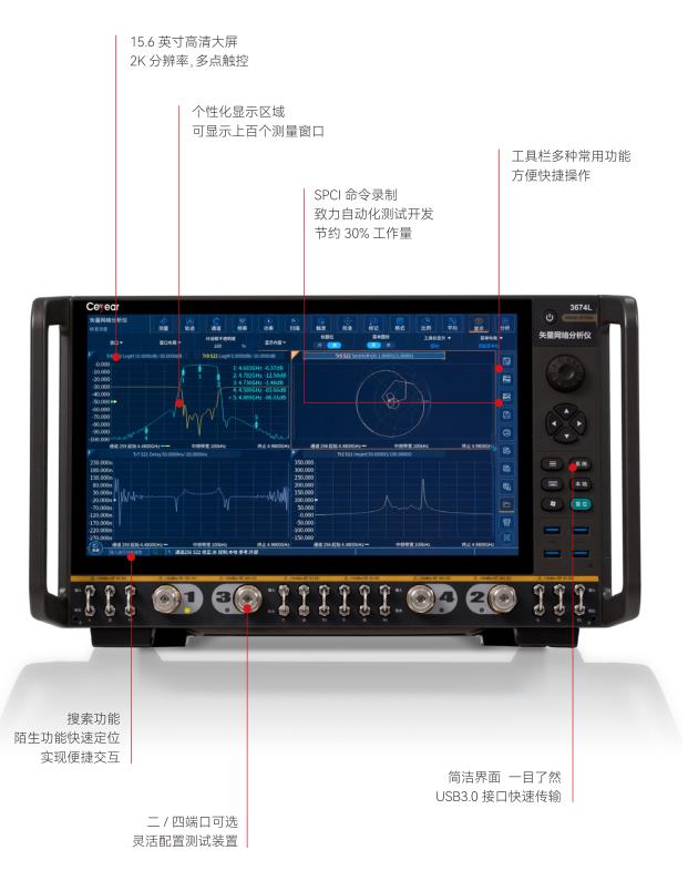 Ceyear 3674係列矢量網絡分析儀是技術創(chuàng)新的巔峰(fēng)之作,可以輕鬆應對半導體芯片測試、材(cái)料(liào)測試、天線測試、高速線(xiàn)纜測試、微(wēi)波部組件測試等(děng)帶(dài)來的嚴峻挑戰。出色的(de)射(shè)頻特(tè)性、靈(líng)活的硬件配置和豐富的軟件功能(néng)相輔相成,隻需一次連接即可完成多種測量任務。創新(xīn)的人機交互設計(jì)可幫助您(nín)快速便捷地完成所需的測量設置,超大觸摸屏為您(nín)帶來靈活、高效的操作體驗。