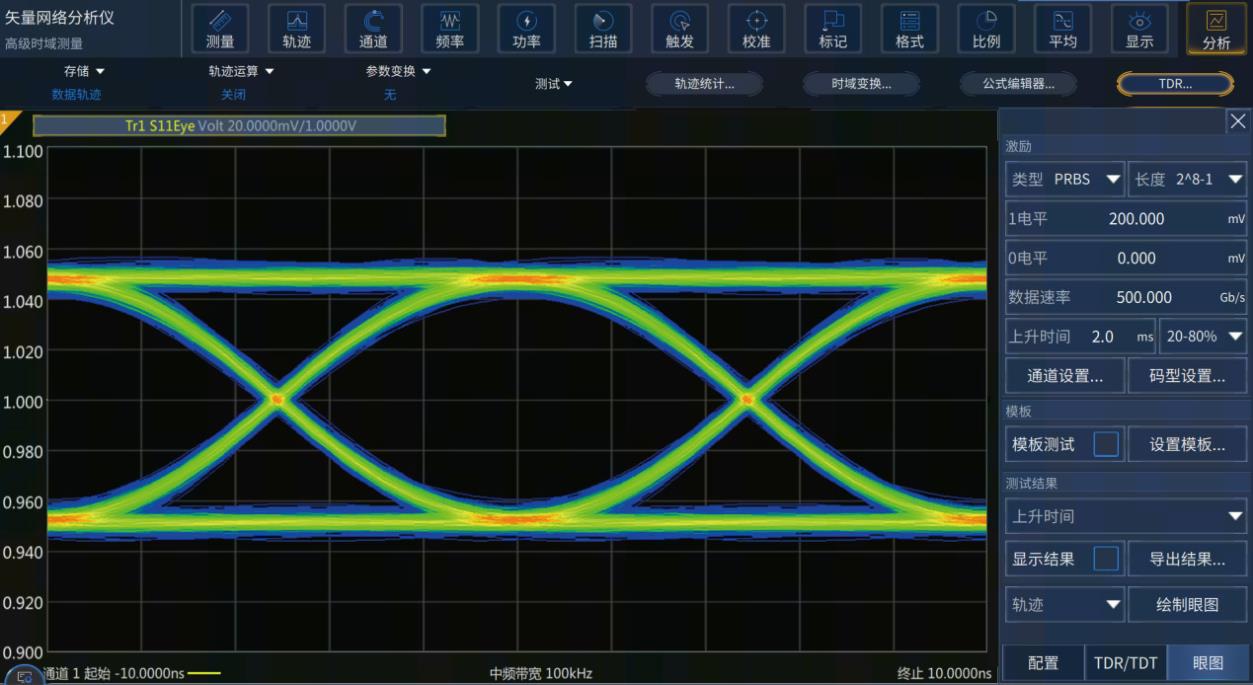 高級時域分析選件具備基於網絡參數的虛擬眼圖(tú)生成及分析功能。根據不同的高速數字通(tōng)信標準,高級時域(yù)分析選件可以使用預先定(dìng)義好的眼圖模板進行高效率Pass/Fail測試。