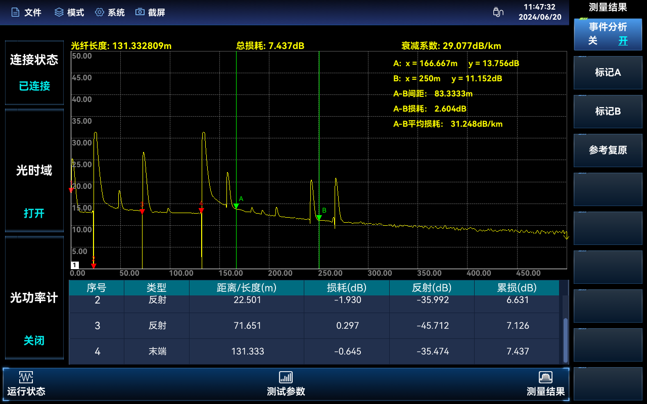 光時域反射計光纖類型G.652單模9/125,測量波長1310nm±20nm & 1550nm±20nm,動態範圍典型值(zhí)38dB
