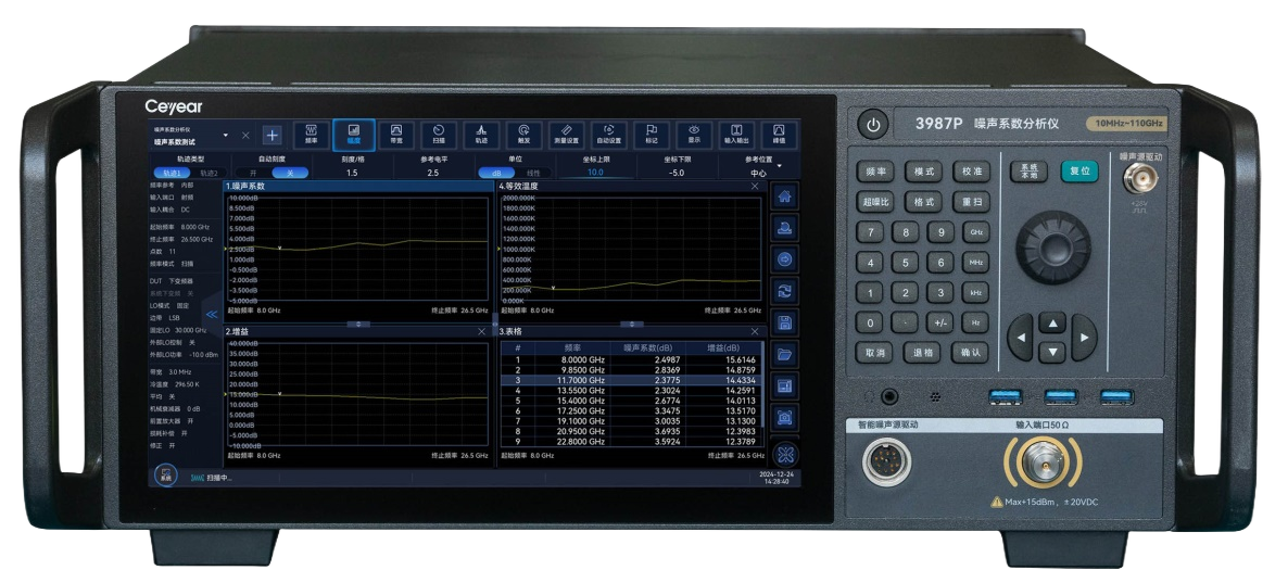 Ceyear 3987噪聲係數分析儀,擁有優異的接收靈敏(mǐn)度,本(běn)機噪聲係數低至4dB,全頻段優於16dB;采用硬件特性漂移(yí)實時校準和誤差(chà)修正技術,噪(zào)聲係數測量不確定度優於0.1dB。不僅可以進行噪聲係數的高精度測試,還可當作高靈敏度接收機用於噪聲源定標,是實驗室到產線理(lǐ)想的測(cè)試設備。