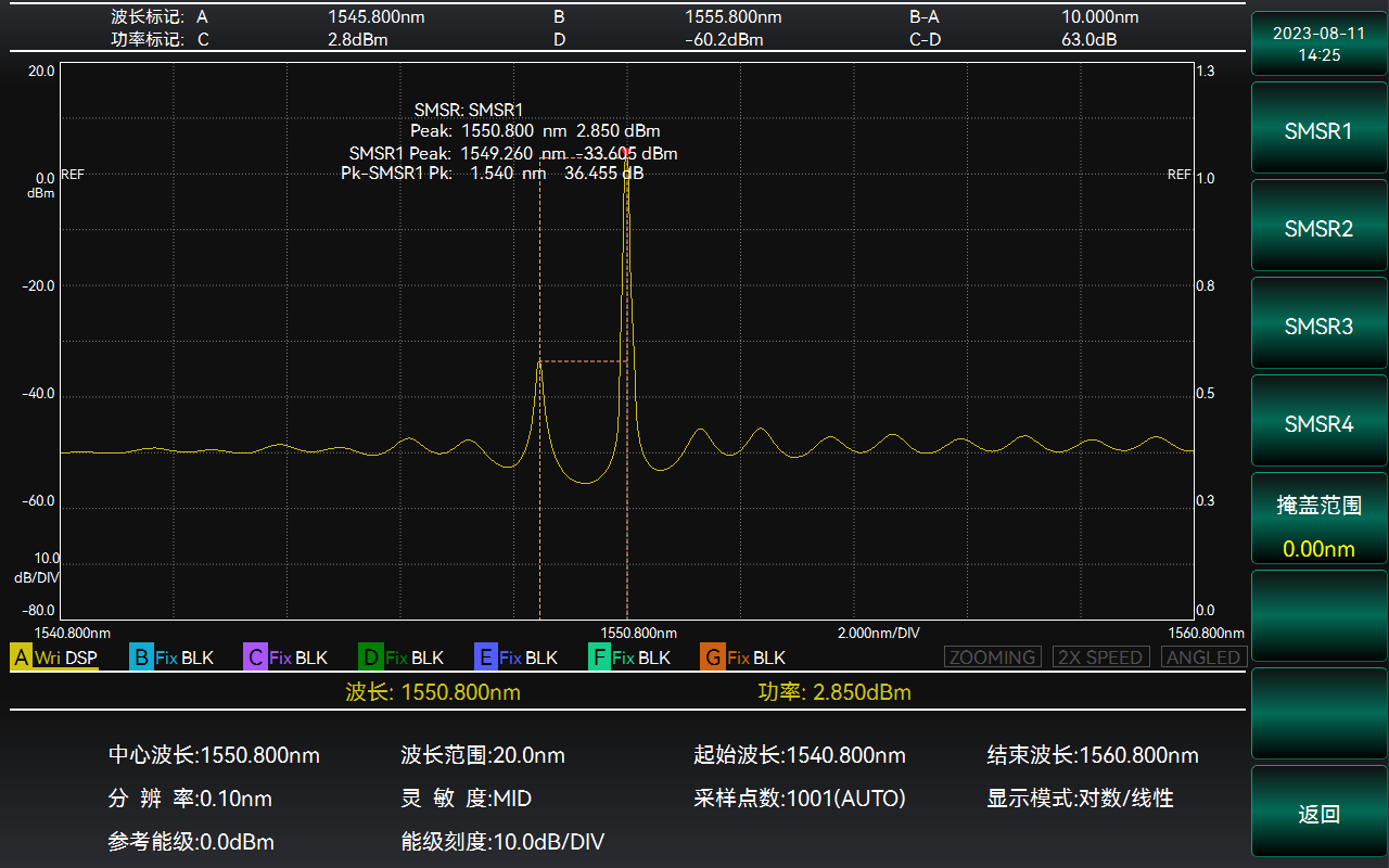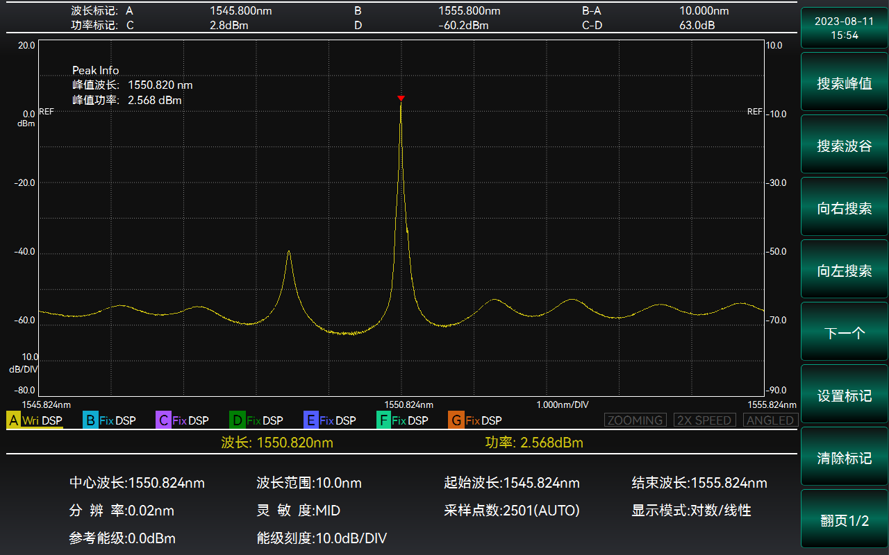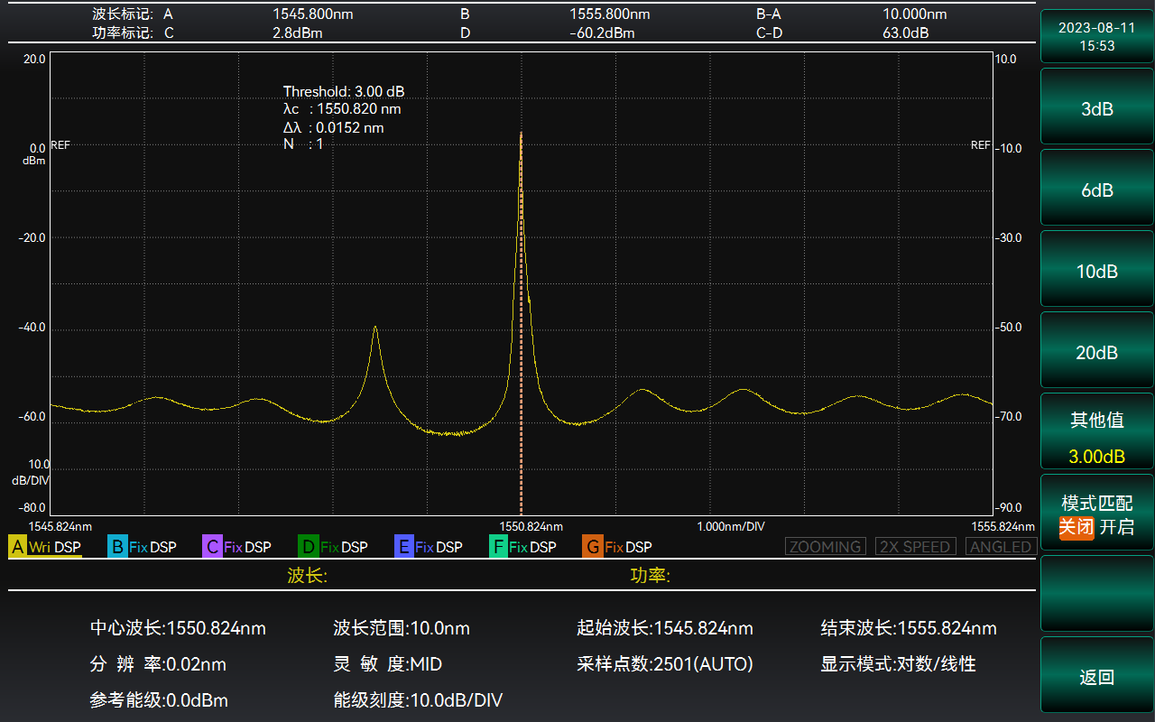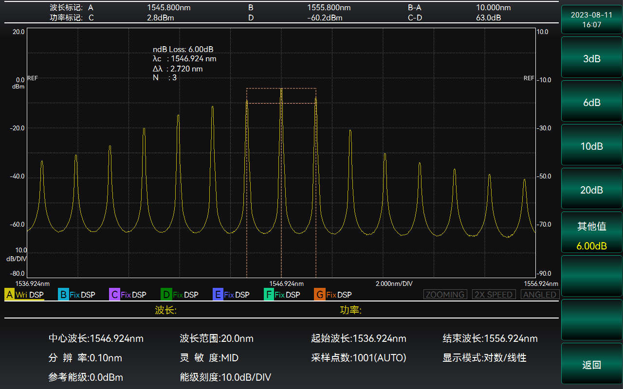 針對FP-LD等多縱模激光光源(yuán),6362D光譜分析儀(光譜儀)提供ndB損耗分(fèn)析、包絡分析和均方根分析(xī)三種分析方法(fǎ),多維度全麵評估多縱模待測光源的中心波長和光譜帶寬。