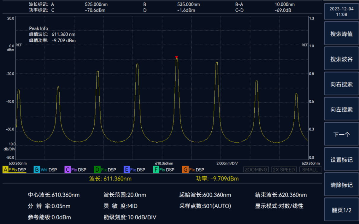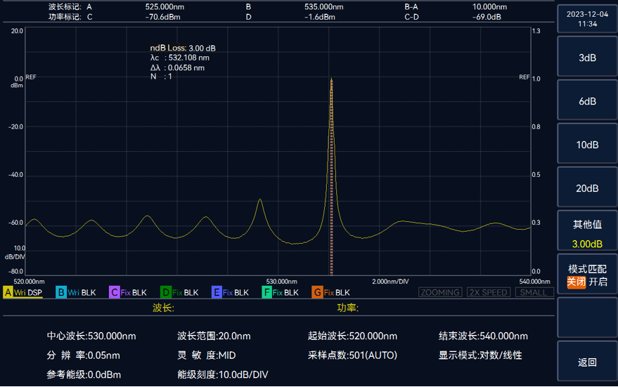 針對FP-LD等多縱模激光光源,6362C光譜分析儀提供ndB損耗分析、包絡分析和均方根分析(xī)三種分析方法,多維度全麵(miàn)評估多縱模待測光源的中心波長和光譜帶寬。