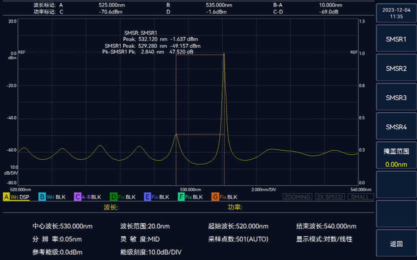 6362C光譜分析儀具備多(duō)場景光譜分析功能,針對DFB-LD等單縱模激光光源,儀器提供閾值分析和邊模抑(yì)製比分(fèn)析兩種分析(xī)方法,有效準確的評估單縱模待測光源的中心波(bō)長、光譜(pǔ)帶寬和邊模抑製比。