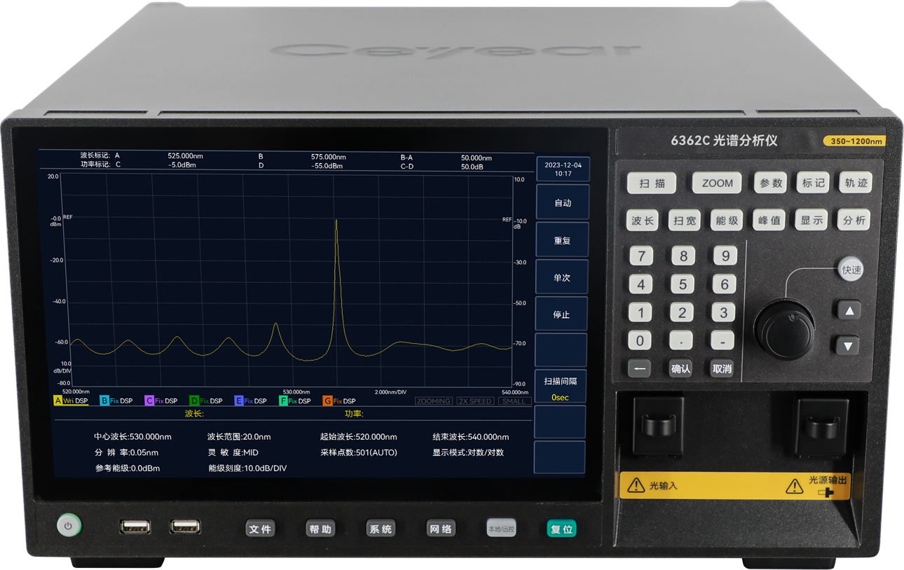 6362C是一(yī)款高分(fèn)辨、大動態高速高(gāo)性能光譜分析儀,適用於350nm~1200nm光譜範圍(wéi)的DWDM等光係統測試;LED、FP-LD、DFB-LD等光有源器件測試;光纖等光無源器件(jiàn)測試。