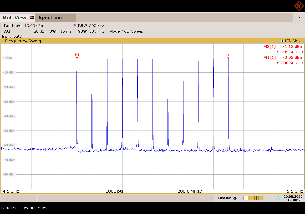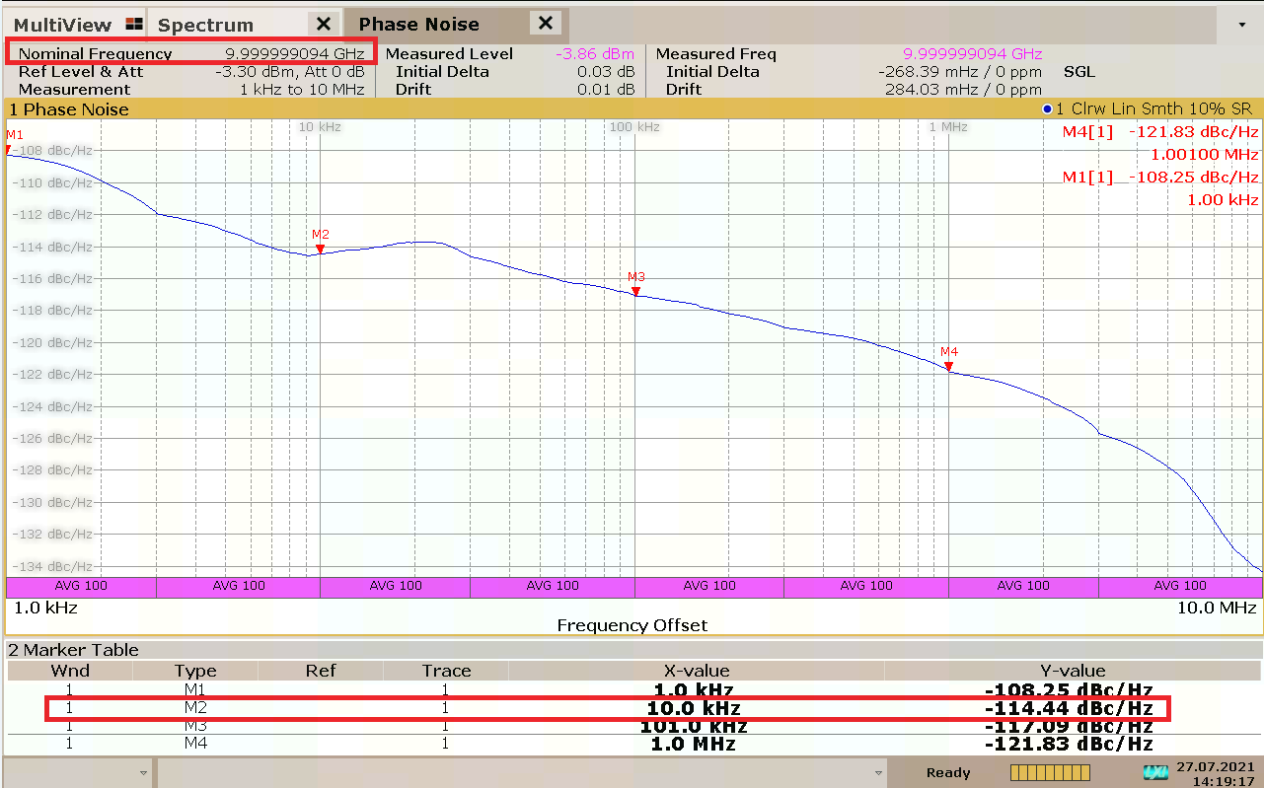 6935DE信號發(fā)生器提供頻率(lǜ)範圍250kHz~20GHz/50GHz(6935DE-H01選(xuǎn)件,典型值1可擴展至54GHz)的(de)高純與超低相噪的本(běn)振(zhèn)信號,頻率轉換時間小(xiǎo)於1ms,單邊帶(dài)相位噪聲(shēng)優於-114dBc/Hz@10kHz頻偏(載波10GHz,典型值1),可達到台式(shì)儀器級別的頻譜純度。