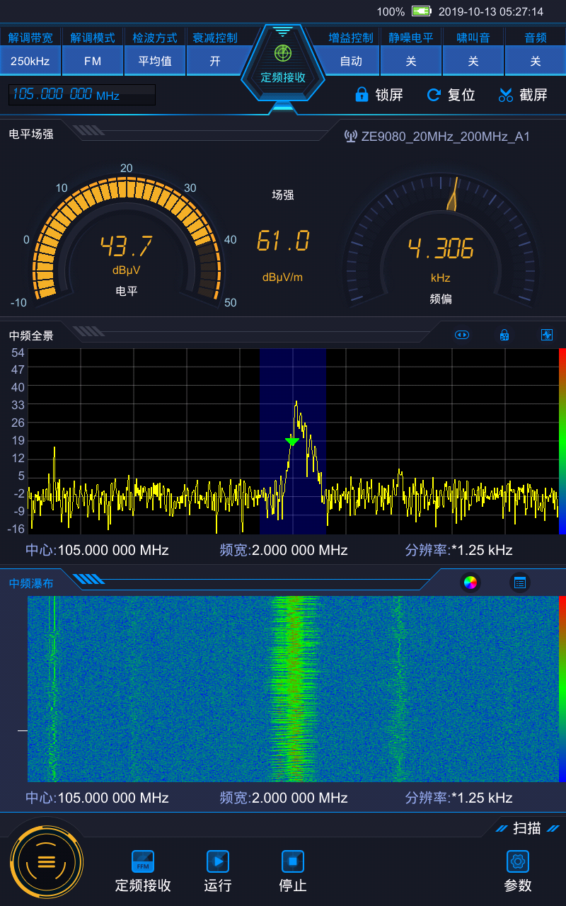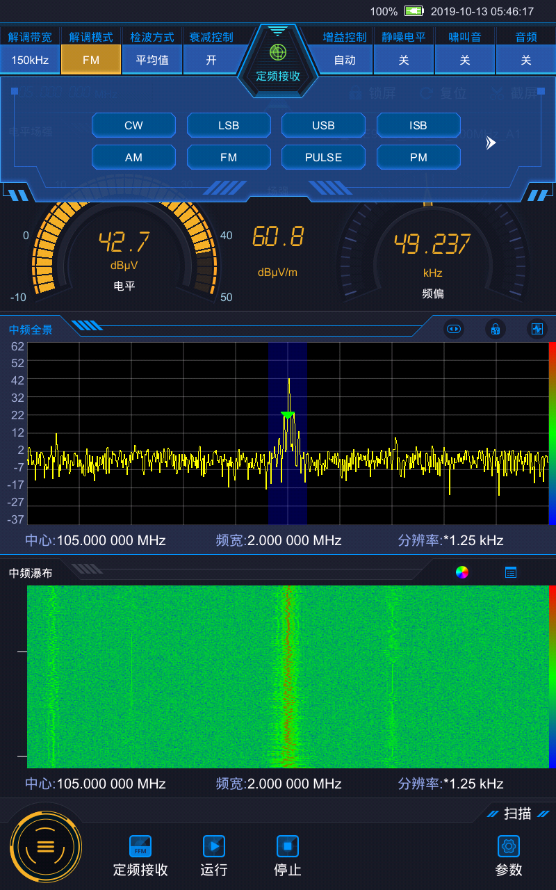 — 實時顯示中頻瀑布圖,並有多種色彩顯(xiǎn)示(shì)模式可選,支持調節顏色顯示閾值,可過濾閾(yù)值以下的信號,方便觀察支持曆史數據回放,縱向滑動瀑布圖或拖動曆史頻標即可在頻譜窗(chuāng)口顯示曆(lì)史數據