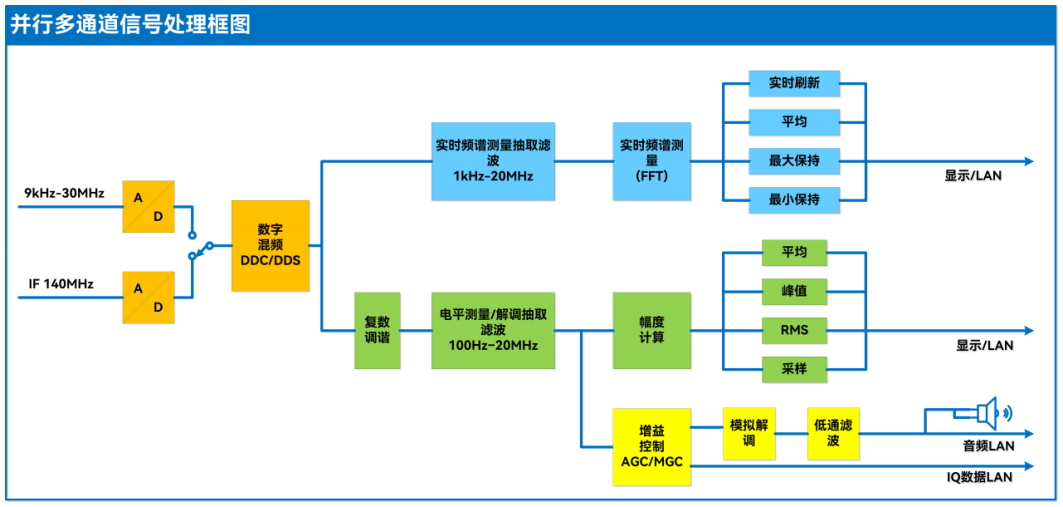 三個並行處理通道分別提(tí)供頻(pín)譜測量、電平場強測量和解 調功能,方便(biàn)用戶獲取信號的多域關聯分析結果。