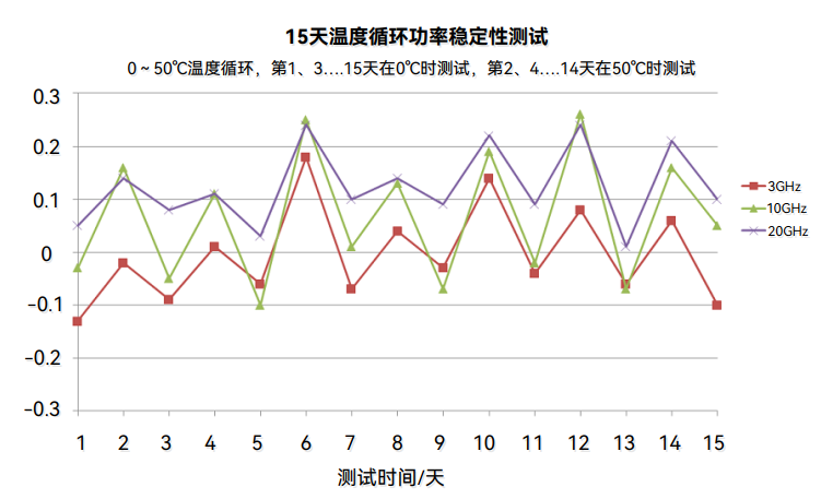 輸出信號的頻率(lǜ)、功率都具有(yǒu)非常高的穩定性。時基老化率±5×10-8/年,10MHz高穩(wěn)時基一(yī)年變化不到0.5Hz。不僅具有優(yōu)異的輸出功率準確(què)度,功率穩定度也非常出色,在(zài)0℃到50℃溫度循環的環境中連續開機15天(tiān),相同溫度下功率變化小於0.2dB,功率溫度變化率小於0.01dB/℃。