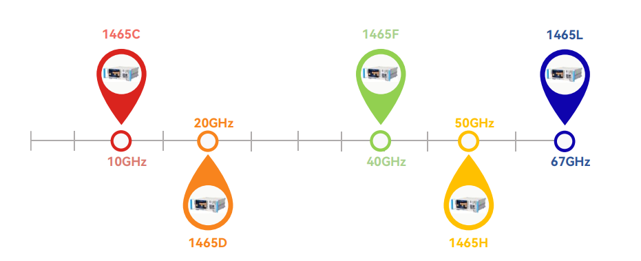 1465C/D/F/H/L頻率範圍為100kHz~10 GHz /20 GHz /40 GHz /50 GHz /67GHz,5種係列化型(xíng)號,1465L可輸出(chū)頻率最高達70GHz。每種(zhǒng)型號都有(yǒu)眾多的選件來進行功能、性能擴展。無論(lùn)您需要計量(liàng)級解決方案,還是基礎型信號發生器,無論您隻(zhī)需射頻波段測試信號還是要求信號頻(pín)率高達毫米波,總有一種型(xíng)號(hào)適合您。