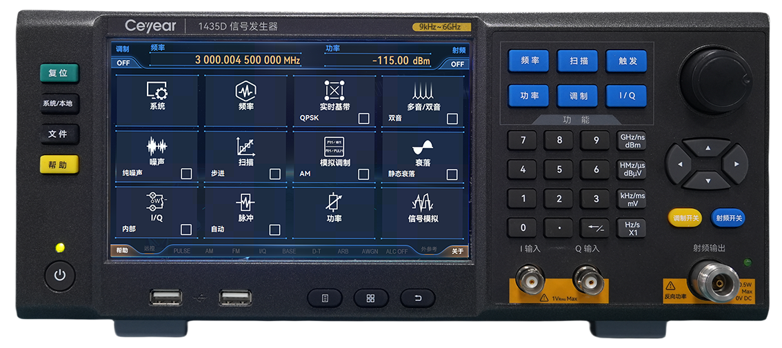 1435-V係列信(xìn)號發生器是一款性能優良的矢量信號(hào)發生器(qì),頻率範圍覆蓋9kHz~6GHz,200MHz內部調製(zhì)帶寬和齊(qí)全的數字調製樣(yàng)式,可(kě)滿足各種寬帶數字調製(zhì)信(xìn)號的模擬需求(qiú)。支持5種下載數據格式的任意波調製,可(kě)以根據用戶需(xū)要編輯、下載配置所需的波形,完成各種信號模(mó)擬,滿足各種複(fù)雜信號的測試需求(qiú);其基帶信號發生器設置簡單、性能優異,支持PSK、QAM、FSK、MSK等超過20種格式的通用數字調(diào)製(zhì)信號的(de)實時發生;具有(yǒu)優良(liáng)的頻譜純度,單邊帶相位(wèi)噪聲1GHz載波@10kHz頻偏(piān)-136dBc/Hz ,6GHz載波@10kHz頻(pín)偏-120dBc/Hz;具(jù)有高功率輸出和大動態範圍,最大輸出功率可達22dBm@3GHz,輸出功率動(dòng)態範圍大於150dB;具有7寸高靈敏度觸摸(mō)LED屏、同時支持觸摸屏、麵板按鍵、旋轉按鈕、外接鼠標鍵盤等多種(zhǒng)操作方式,操作體驗全麵升級;3U便攜式(shì)機箱結構(gòu),體積小重量輕,便於(yú)攜帶。1435-V在緊(jǐn)湊的空間(jiān)內實現優異的性(xìng)能,既可以滿足設備研(yán)發階段對(duì)高性(xìng)能測試需求,也可以(yǐ)滿足生產階段對高效率測試需求。