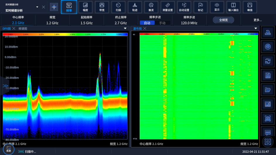 Ceyear 4082係列信號/頻譜分析儀支持掃頻和(hé)FFT兩種掃描類型,掃描點數在101~120001之間任意可選,最長掃描時間16000s,零頻寬最短掃描時間1us;支持(chí)6條軌跡配置、6種檢波方式、3種平均類(lèi)型,具有噪聲標記、帶寬功率、功率譜密度等豐富的標記測量(liàng)功能,並支持軌跡(jì)統計(jì)、軌跡自動保存和調(diào)用(yòng)等;支持(chí)曆史軌跡(jì)的瀑布圖顯示,可(kě)保存10000幀的瀑布圖軌(guǐ)跡,清晰展現信號頻(pín)譜變化規律(lǜ);具(jù)備占(zhàn)用帶(dài)寬、鄰/信道功率、功率統計、突發功(gōng)率(lǜ)、諧波失真(zhēn)、三階交調、雜散發射、頻譜發射模(mó)板(bǎn)等一鍵功能,可提供(gòng)更全麵、細致的分析結(jié)果。