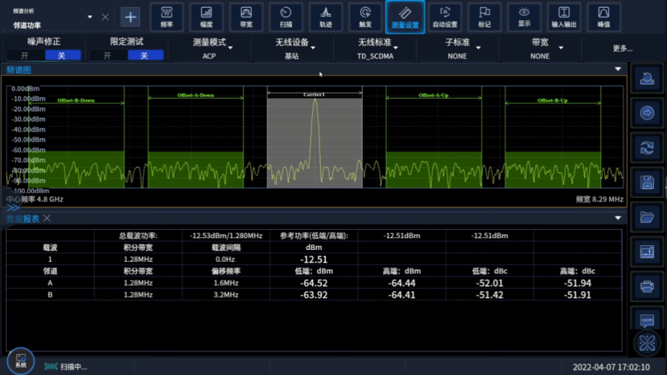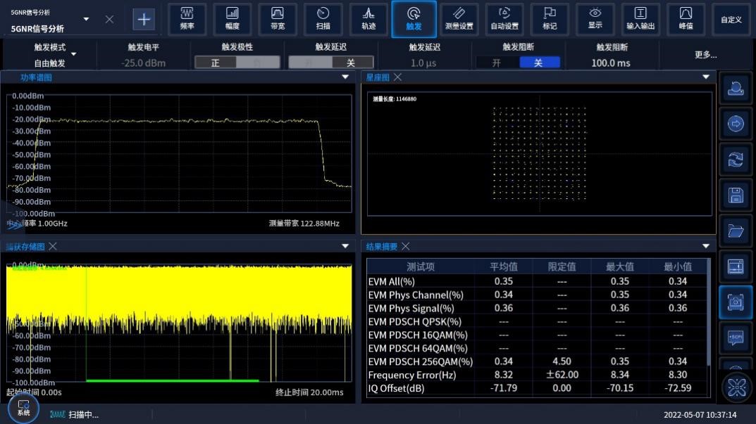 Ceyear 4082係列信(xìn)號/頻譜分析儀5G NR測量功能可對3GPP Rel 15和Rel 16版本的5G NR上行(háng)和下行信號進行帶內(nèi)解調分析,支持(chí)FDD、TDD兩種雙工模式,支持QPSK到256QAM調製格式,支持Test Model和自定義(yì)參數設置,支持提供不同信道和信號的誤差矢量幅度(EVM)、頻率誤差和功(gōng)率等測量結果,具備星座圖、誤差總結表、資源分配等多種顯示圖譜;在帶外測量方麵,4082能提供廣泛的標準和限值(zhí)線一鍵設置能力,高效率執行鄰信道泄漏(lòu)比(ACLR)、頻譜發射模板(SEM)等測量。搭配Ceyear專用的協議分析軟件,可對LTE、LTE-Advanced、NB-IoT、WCDMA、GSM、EDGE通信信號進行帶內調製分析,提供EVM、星(xīng)座圖、頻率誤差等多種測量結(jié)果。
