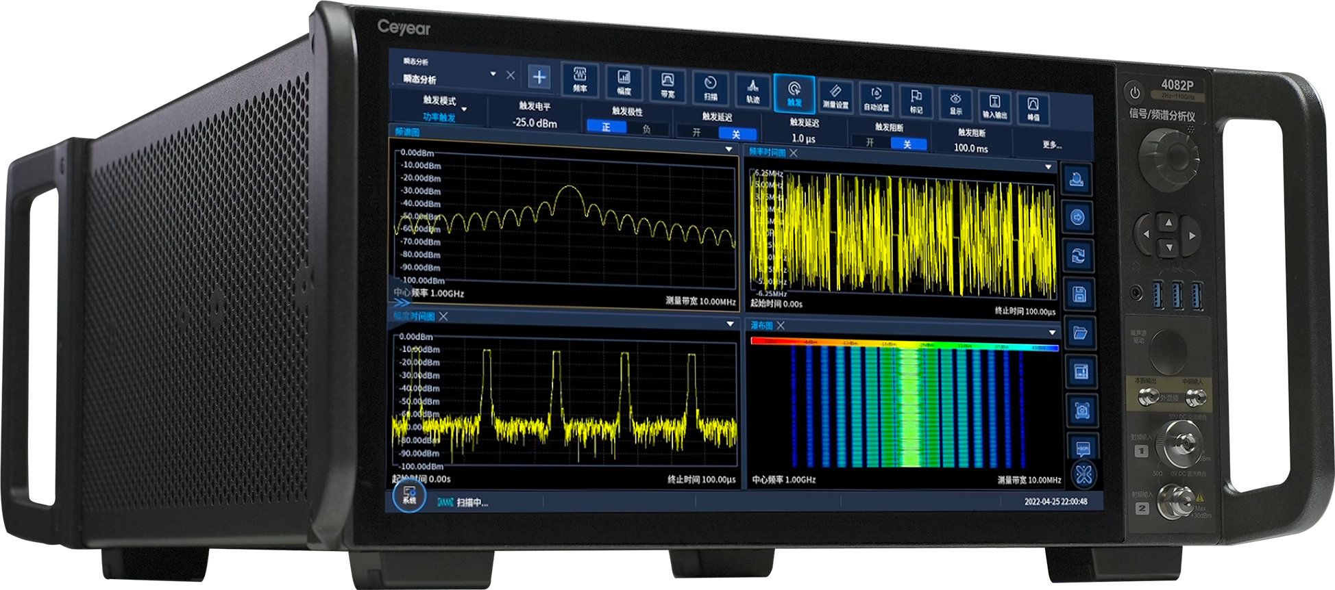 Ceyear 4082係列信號/頻譜分析儀提供(gòng)10MHz/40MHz/200MHz/400MHz/600MHz/1.2GHz/2GHz/4GHz共8種帶寬配置選擇,滿足寬帶5G NR、WLAN等不同測試應(yīng)用場景使(shǐ)用需求(qiú);提供1.2GHz帶(dài)寬的實時頻譜分析,100%截獲概率(POI)信號最短持續時間優於0.53μs,可用(yòng)於(yú)脈衝信號、毛刺信號、間歇性信號等各種瞬態突發信號的捕獲測量。
