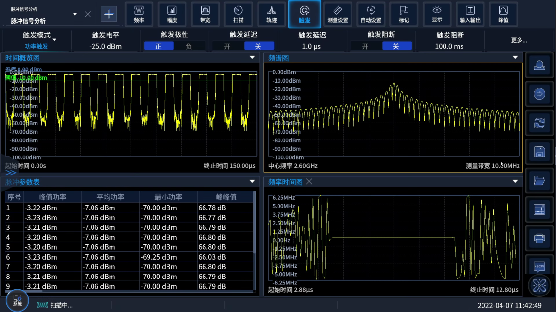 實時頻譜分析(xī)功能(néng)支持瞬態、突發幹擾信號的發現、瞬態信號數據觸發截獲、瞬態信號(hào)事件時域頻域分析等功能。