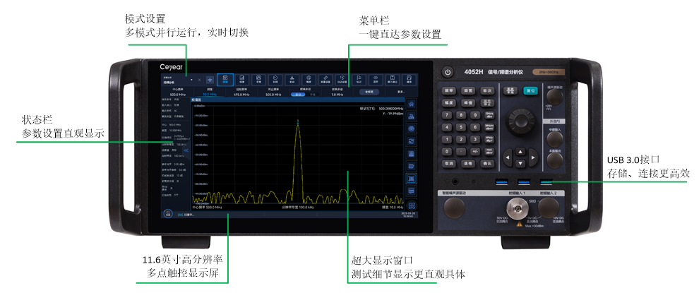 Ceyear 4052具備出色的測試動態(tài)範圍、相位噪聲、幅度精度和(hé)測試速度,具備頻譜分析、I/Q分析(xī)、實時頻譜分析、瞬態分析、矢量信號分析、脈衝分析(xī)、音頻分(fèn)析等豐富的測試功能。