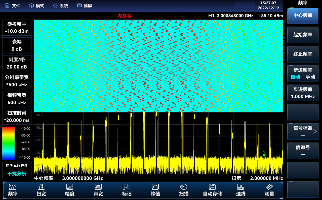 實時頻譜分析功能主要用(yòng)於對瞬態時變(biàn)信號、突發信號的捕獲和分析,實時分析帶寬最大(dà)40MHz,可實現瞬態信號數字餘輝和瀑布圖測量功(gōng)能。
