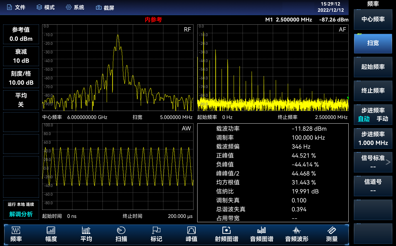 參數分析:可對調製信號(hào)的載波功率、調製率、載波頻偏、調(diào)製深度(AM)、調製頻偏(piān)(FM)、調製相(xiàng)偏(PM)、信納比、調製失真、總諧波失真等參數進行(háng)測量分析。