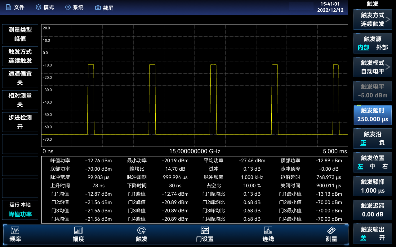 方(fāng)便快捷的用戶(hù)操作體驗:12.1寸電容(róng)觸摸屏、支持多點觸控,具有6個獨立標記,支持信號跟蹤與峰值跟蹤,具有3條顯示跡線、6種檢波方式(標準、正峰值、負峰值、取樣、均值、均方根),支持HDMI輸出;